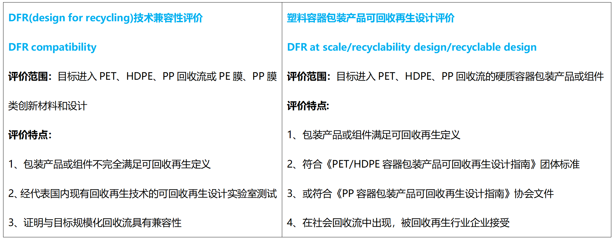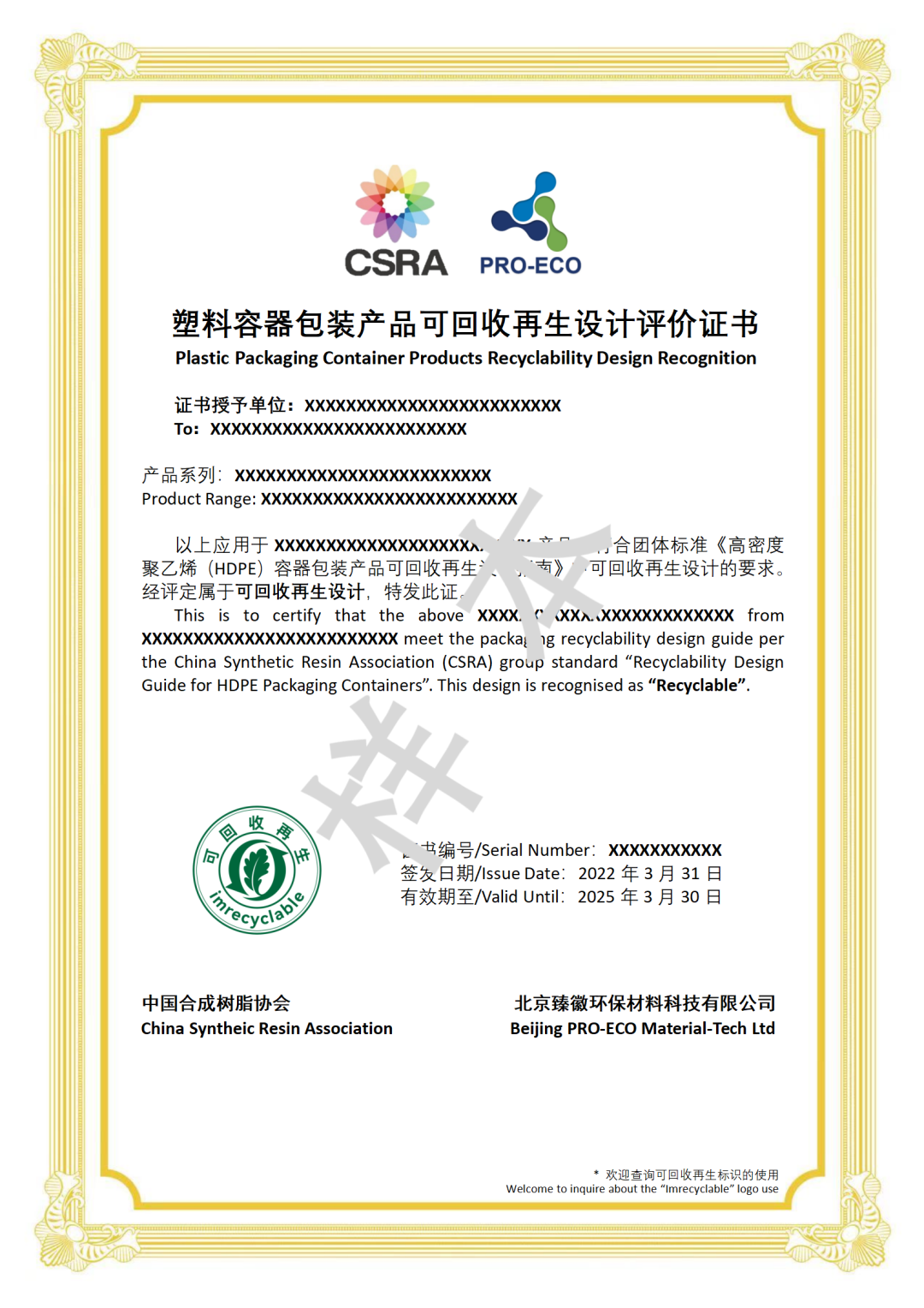 Pada bulan Maret 2022, grup Asosiasi Resin Sintetis China menstandarkan "Panduan Desain untuk Daur Ulang dan Daur Ulang Produk Wadah dan Kemasan Polyethylene Terephthalate (PET)" dan "Panduan Desain untuk Daur Ulang dan Daur Ulang Produk Wadah dan Kemasan Polietilen Densitas Tinggi (HDPE)" Diluncurkan secara resmi; sekaligus meluncurkan "Evaluasi Desain Produk Kemasan Wadah Plastik yang Dapat Didaur Ulang" dan menerbitkan batch pertama kasus desain produk yang dievaluasi.