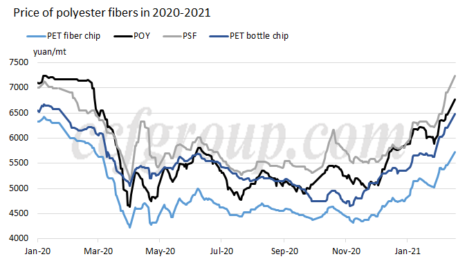 Perusahaan serat poliester menikmati kekuatan diskursif terhadap penawaran pasar ketika beban persediaan tidak tinggi, biaya bahan baku tinggi, pemulihan hilir lancar dan kapasitas hilir diperkirakan meningkat pada paruh pertama tahun 2021. Sebenarnya, harga produk poliester cenderung naik pada tahun jangka pendek karena perusahaan poliester ingin menaikkan harga. Didukung oleh biaya, harga serat poliester diperkirakan akan kembali ke tingkat sebelum pandemi. Harga PSF kini telah mencapai level sebelum pandemi.